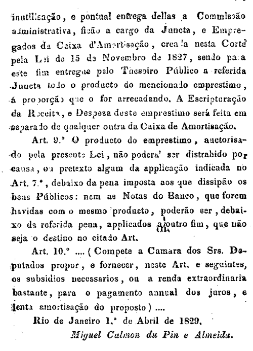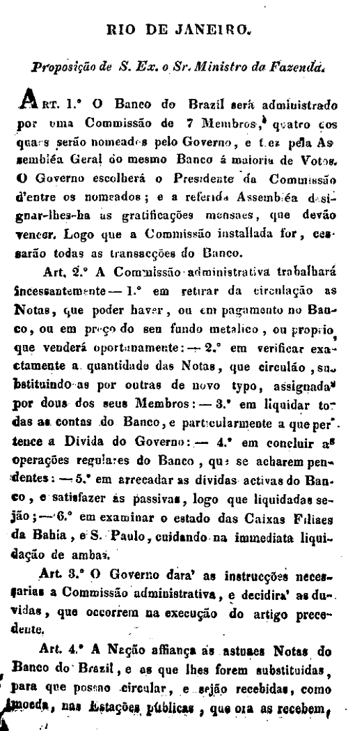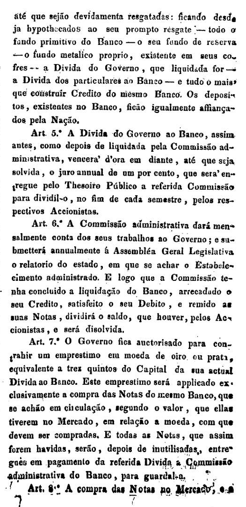 As notas do banco do Brasil só são recebidas em pagamento, nas estações publicas da côrte, e provincia do Rio de Janeiro, e portanto só ahi podem pagar todas as funcções do papel do governo, o ter curso como moeda. Os estatutos da caixa filial de S. Paulo impõe porém a este estabelecimento o dever de trocar sem premio ou agio algum, as notas do banco e as notas da caixa filial, que devem ser recebidas nas estações publicas da provincia.
